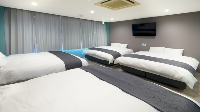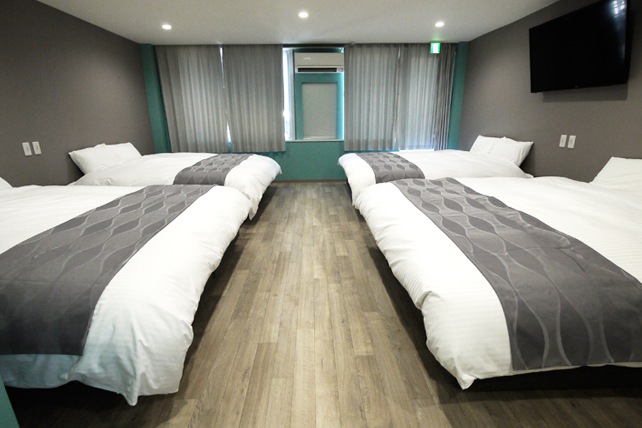 Wi-Fi無料 / コンセント完備 / シモンズベッド横180×縦195 キングサイズ4台 / バスタオル・フェイスタオル・スリッパ・歯ブラシセット・髭剃り・綿棒 / シャンプー、リンス、ボディソープ / 冷蔵庫・テレビ・ドライヤー・ケトル