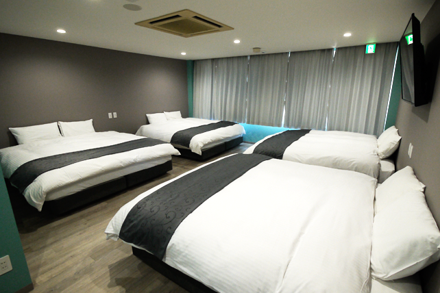 88HOTELSは1フロアに1部屋のみ、2階と3階に1部屋ずつの貸し切り利用が出来るホテルです。キングサイズのベッドが4台ありますので最大8名様までご宿泊いただけます。